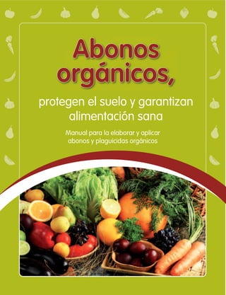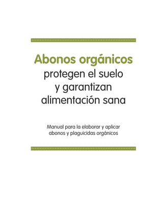 Este documento proporciona información sobre abonos orgánicos y su importancia para proteger el suelo y garantizar una alimentación sana. Explica que los abonos orgánicos mejoran las propiedades físicas, químicas y biológicas del suelo y nutren las plantas de una manera sostenible. También describe dos tipos de abonos orgánicos comunes, el compost y el bocashi, y proporciona consejos sobre cómo elaborar y aplicar estos abonos de manera efectiva. El objetivo general es