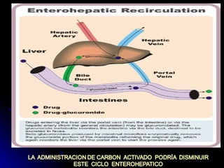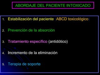 El documento describe el abordaje del paciente intoxicado en 5 pasos: 1) estabilización del paciente, 2) prevención de la absorción del tóxico, 3) tratamiento antidótico específico, 4) incremento de la eliminación y 5) terapia de soporte. Incluye detalles sobre cómo estabilizar al paciente, prevenir la absorción a través de la piel, pulmones, tracto gastrointestinal y ojos, y tratar la intoxicación con antídotos, diuresis forzada u otros métodos.
