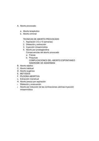 Este documento presenta información sobre el aborto desde diferentes perspectivas. Brevemente describe los tipos de aborto, las técnicas de aborto provocado, las consecuencias del aborto y las opiniones de estudiantes universitarios sobre el tema. También analiza el aborto desde la perspectiva legal y bíblica. En general, el documento ofrece una visión general equilibrada sobre un tema complejo que involucra consideraciones médicas, legales y éticas.