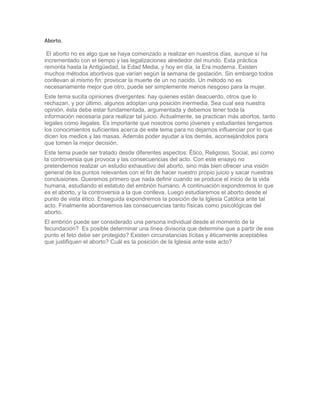 El documento trata sobre el tema del aborto. Explica que el aborto se ha practicado desde la antigüedad y ha incrementado con el tiempo y las legalizaciones. Hay diversos métodos abortivos que dependen de la semana de gestación pero todos tienen el mismo fin de provocar la muerte del feto. Este es un tema que genera opiniones divergentes ya que algunos están a favor, otros en contra y otros adoptan una posición intermedia. El documento también menciona que es importante que los jóvenes tengan conocimiento sobre este tema para tomar decisiones informadas.