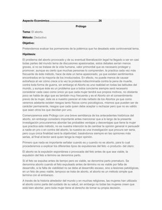 Este documento presenta una clasificación de los diferentes tipos de aborto, incluyendo el espontáneo, inducido, terapéutico, ético y eugénico. También describe las posibles consecuencias físicas y psicológicas del aborto para la mujer, como efectos a corto y largo plazo, incluyendo esterilidad, infecciones, depresión y culpa. Finalmente, analiza aspectos éticos y legales en torno al aborto desde diferentes declaraciones de derechos.