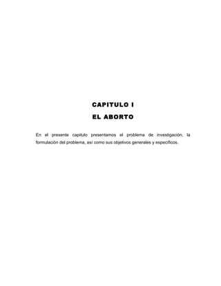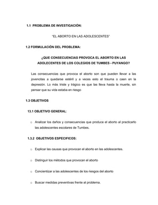 El documento presenta el problema de investigación sobre los efectos del aborto en adolescentes. Los objetivos son analizar los daños del aborto en estudiantes de Tumbes, explicar las causas del aborto adolescente, distinguir los métodos abortivos, concientizar sobre riesgos del aborto, y proponer medidas preventivas. También define términos como embarazo adolescente, aborto, tipos y causas de aborto, y consecuencias físicas y emocionales. La metodología incluye entrevistas a estudiantes y autoridades para analizar la problem