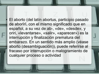 El aborto se refiere a la interrupción prematura del embarazo, ya sea de forma espontánea o provocada. El aborto espontáneo ocurre cuando el feto muere de forma natural, generalmente debido a anomalías genéticas o problemas de salud de la madre, mientras que el aborto provocado interrumpe el embarazo de manera intencional. El documento también explica que un aborto espontáneo se considera muerte fetal cuando ocurre después de las 22 semanas de gestación o si el peso del feto supera los 500 gramos.