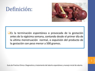 Este documento define el aborto y describe su etiología, clasificación, diagnóstico y tratamiento. El aborto se define como la terminación espontánea o provocada de la gestación antes de las 20 semanas o la expulsión de un producto de concepción menor a 500 gramos. Los factores que causan aborto incluyen anomalías ovulares, infecciones, enfermedades maternas y factores uterinos. El tratamiento puede ser médico utilizando misoprostol u quirúrgico mediante legrado uterino o aspiración manual end