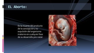 El documento define el aborto como la muerte del producto de la concepción y su expulsión del organismo materno en cualquier fase de su desarrollo pre-natal. Explica que el 25% de la población mundial prohíbe completamente el aborto o sólo lo permite para salvar la vida de la mujer, mientras que el 62% lo permite bajo diferentes circunstancias. También describe los tipos de aborto espontáneo y provocado, y clasifica el aborto eugenésico y por honor.
