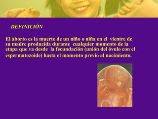 El documento define el aborto como la muerte de un niño en el vientre de la madre desde la fecundación hasta el nacimiento. Explica que hay abortos espontáneos y provocados, y describe varios métodos de aborto provocado como la succión, la dilatación y curetaje, y el parto parcial. También discute las causas, efectos y tipos de aborto, así como su legalidad en diferentes países. Concluye que aunque el aborto es una práctica común, es un tema controversial que involucra aspectos como el inicio de