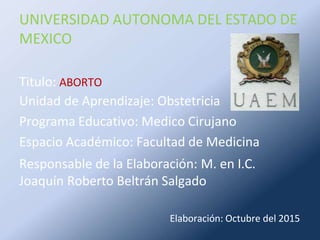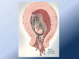 Este documento trata sobre el aborto espontáneo y provocado. Define el aborto espontáneo como la terminación natural del embarazo antes de las 20-22 semanas. Explica las causas, clasificaciones, diagnósticos y tratamientos de diferentes tipos de aborto como amenaza de aborto, aborto inevitable, incompleto, completo, diferido y séptico. También cubre el aborto recurrente y los auxiliares de diagnóstico como ultrasonido y perfil hormonal.