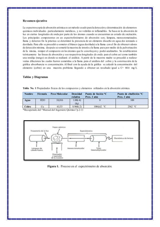 La práctica determinó la concentración de cobre en una muestra problema usando espectroscopía de absorción atómica. Se construyó una curva de calibración usando varias diluciones de una muestra madre de cobre y se midió la absorbancia. La curva tuvo una tendencia lineal con R2=0.9928. Usando la curva, se calculó que la concentración de cobre en la muestra problema era de 68.6 mg/L.