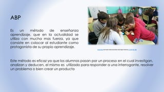 Este documento describe el método de aprendizaje apoyado por proyectos (ABP). Explica que el ABP pone al estudiante como protagonista de su propio aprendizaje a través de la investigación, análisis y creación de un producto. Detalla los pasos para realizar un ABP, incluyendo la motivación, selección del tema, investigación, análisis, creación de un producto y presentación. También discute el rol del docente en este método y formas de evaluar un proyecto de ABP.