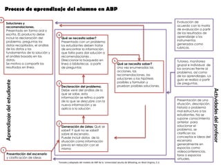 Este documento describe el proceso de aprendizaje basado en problemas (ABP). El proceso consta de 6 pasos: 1) presentación del escenario, 2) generación de lo que se sabe y no se sabe, 3) declaración del problema, 4) determinación de lo que se necesita saber, 5) búsqueda de información y posibles soluciones, y 6) presentación de soluciones y evaluación. El objetivo es que los estudiantes desarrollen soluciones a problemas reales mediante la investigación y colaboración.