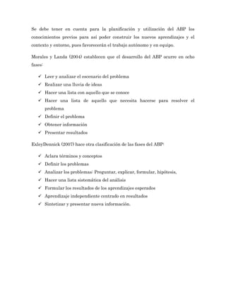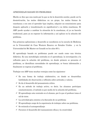 El documento describe el aprendizaje basado en problemas (ABP), un enfoque centrado en el estudiante donde se presenta un problema y los estudiantes aprenden a resolverlo. Explica que el ABP comenzó en las escuelas de medicina en los años 1960 y puede usarse como una técnica didáctica. Ofrece varias ventajas como el desarrollo del pensamiento crítico y el aprendizaje centrado en el estudiante. También describe las diferentes fases del ABP y los roles del profesor y los estudiantes. Finalmente, discute formas