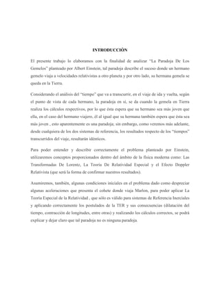 Este documento presenta la Paradoja de los Gemelos planteada por Albert Einstein. Describe el caso de dos hermanos gemelos, donde uno viaja en una nave espacial a velocidades relativistas mientras que el otro permanece en la Tierra. Debido a los efectos de la dilatación del tiempo predichos por la teoría de la relatividad especial de Einstein, cada hermano calcula que el otro envejecerá más lentamente. Esto aparentemente es una paradoja, pero se explica teniendo en cuenta los diferentes marcos de referencia de cada hermano.