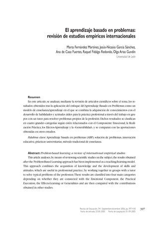 Este documento presenta una revisión de estudios empíricos internacionales sobre el aprendizaje basado en problemas (ABP). El autor analiza 15 estudios publicados entre 2000-2005 que evalúan los resultados de la aplicación del ABP en diferentes áreas del conocimiento. Los resultados se clasifican en cuatro categorías: componente emocional, realización práctica, efectos de aprendizaje y generabilidad. El objetivo es comparar los hallazgos con investigaciones previas sobre los beneficios del ABP.