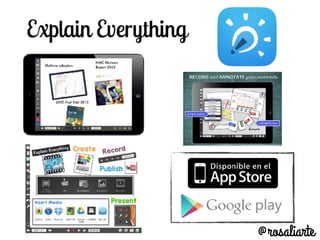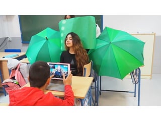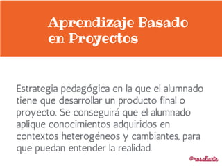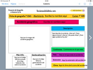El documento detalla varios proyectos educativos en los que los alumnos trabajan de manera colaborativa para aprender sobre historia, mitología, meteorología y técnicas de video. Cada proyecto incluye la creación de materiales como fichas, vídeos, cómics o un parque temático, utilizando diversas aplicaciones y herramientas para fomentar la creatividad y el aprendizaje activo. Además, se enfatiza la importancia de la interdisciplinariedad en la enseñanza.
