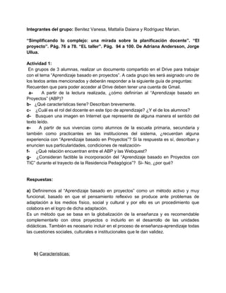 El documento presenta la actividad 1 de un grupo de tres estudiantes sobre aprendizaje basado en proyectos. Responden preguntas sobre la definición, características, rol del docente y alumnos, y experiencias previas con este método. Argumentan que es un método activo que requiere trabajo en equipo y solución de problemas reales. Explican que los docentes guían el proceso mientras los alumnos trabajan de forma activa y autónoma. El grupo también analiza la relación entre aprendizaje basado en proyectos y las webquests.