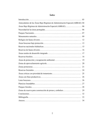 Este documento describe las diferentes categorías de Áreas Bajo Régimen de Administración Especial (ABRAE) en Venezuela, incluyendo parques nacionales, monumentos naturales, refugios de fauna silvestre y otras. Explica que las ABRAE cubren el 46% del territorio venezolano y están protegidas por ley para conservar ecosistemas, flora y fauna. Además, incluye una tabla con información sobre 43 parques nacionales, incluyendo su ubicación, área y ecoregión.