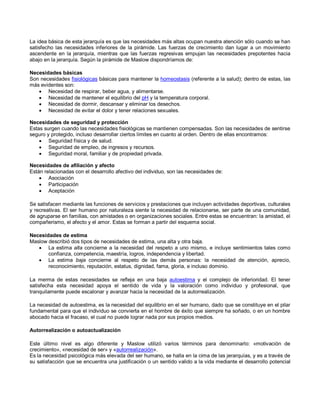 Abraham Maslow fue un psicólogo estadounidense nacido en Brooklyn que propuso la teoría de la jerarquía de necesidades humanas. Según su teoría, las personas están motivadas a satisfacer necesidades básicas como el hambre y la sed antes de poder enfocarse en necesidades más elevadas como la autoestima y la autorrealización. Maslow estudió personas mentalmente sanas para desarrollar esta teoría de la motivación humana, conocida como la pirámide de Maslow, que clasifica las necesidades en cinco niveles jerárqu