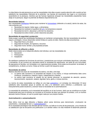 Abraham Maslow fue un psicólogo estadounidense nacido en Brooklyn que propuso la teoría de la jerarquía de necesidades humanas. Según su teoría, las personas están motivadas a satisfacer necesidades básicas como el hambre y la sed antes de poder enfocarse en necesidades más elevadas como la autoestima y la autorrealización. Maslow identificó cinco niveles de necesidades en forma de pirámide, desde las fisiológicas en la base hasta la autorrealización en la cima. Su teoría sugiere que las