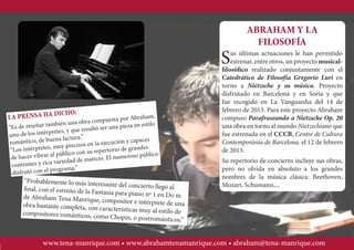 Abraham Tena-Manrique es un pianista y compositor español que realizó estudios de música en Barcelona y Nueva York. Ha actuado como solista y en dúo con su hermana en numerosas ciudades de España, interpretando obras clásicas y estrenando sus propias composiciones. Recientemente ha estrenado proyectos que combinan la música y la filosofía de Nietzsche.