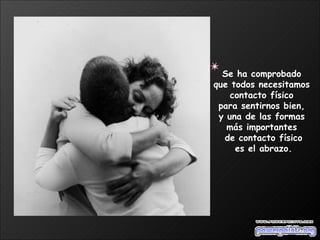 El documento describe los beneficios físicos y emocionales de los abrazos. Abrazar a otras personas aumenta la confianza, seguridad y bienestar, aliviando el estrés, la ansiedad y la depresión. Los abrazos regulares son necesarios para sobrevivir, mantenerse y desarrollarse como persona.