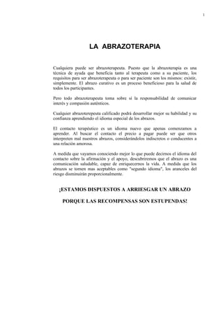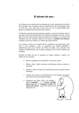 El documento presenta diferentes tipos de abrazos y sus beneficios para la salud y las relaciones interpersonales. Describe abrazos como el abrazo de oso, el abrazo sándwich, el abrazo de mejilla, el abrazo grupal y otros, explicando cómo se realizan y en qué contextos son adecuados. El objetivo general es promover el contacto físico afectuoso a través de los abrazos.