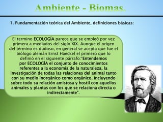 Este documento presenta información sobre conceptos básicos de ecología y ambientes. Define ecología como la ciencia que estudia las interacciones entre organismos y su ambiente. Explica que un ecosistema está compuesto por factores bióticos como plantas, animales y microorganismos, y factores abióticos como luz, temperatura y agua. También describe diferentes biomas que se encuentran en Venezuela como bosques húmedos tropicales, bosques párameros y bosques xerófilos.
