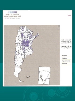 El documento describe la naturaleza y características de los municipios en Argentina. Un municipio es una entidad de derecho público constituida por una comunidad de vecinos que administra sus propios intereses dependiendo en mayor o menor medida del estado provincial. Los municipios varían en tamaño poblacional, competencias, y grado de autonomía según cada provincia. El documento también explica la evolución histórica de los municipios y las diferentes funciones que cumplen en la actualidad.