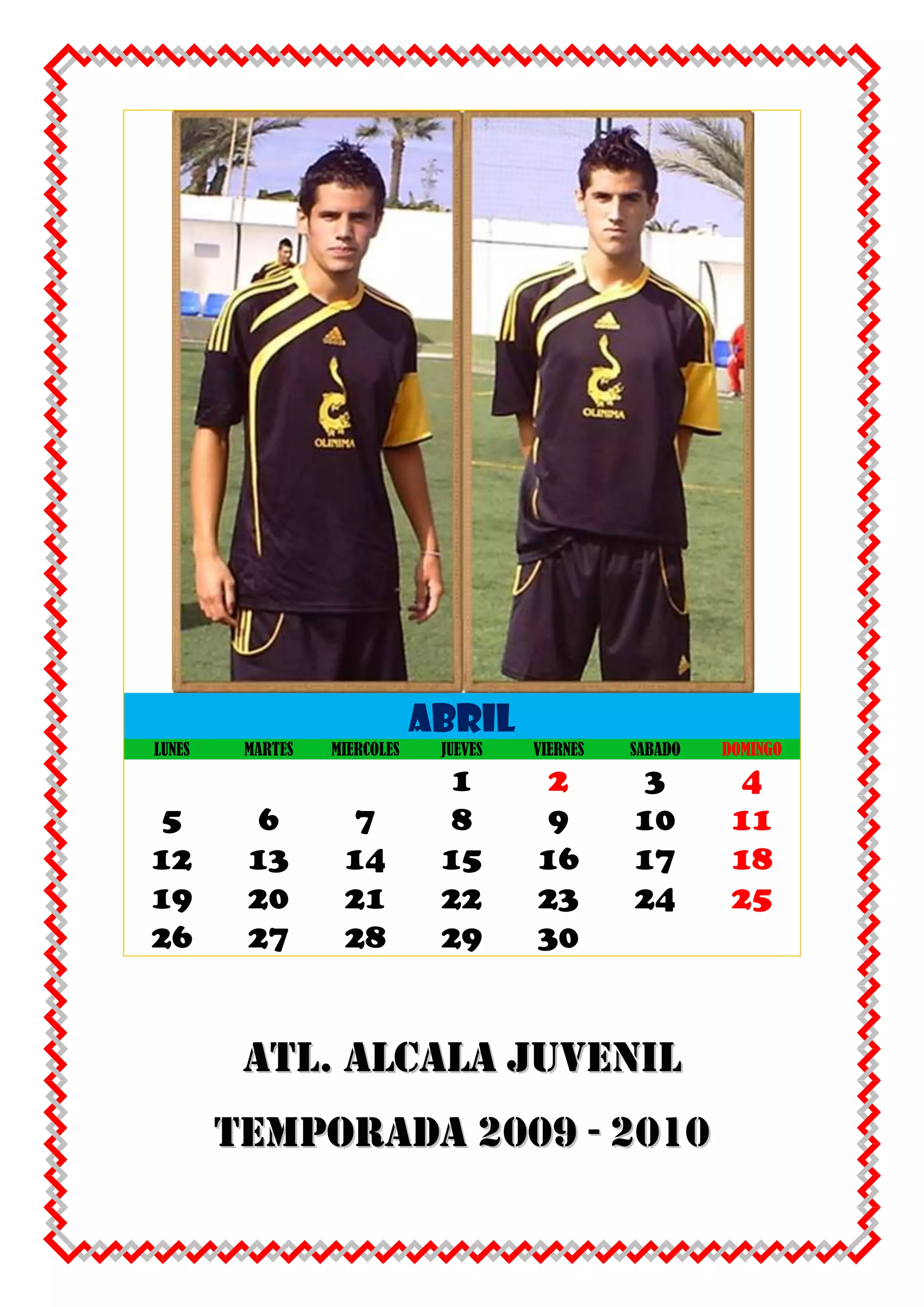 Un calendario mensual enumera los días de la semana y las fechas de 1 a 30. Contiene información sobre un equipo de fútbol juvenil llamado Atl. Alcalá para la temporada 2009-2010.