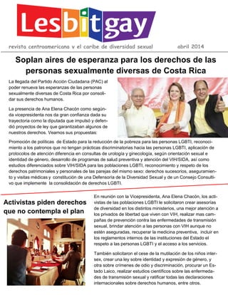El documento habla sobre las esperanzas renovadas de los derechos de las personas LGBT en Costa Rica con la llegada del nuevo gobierno. Se mencionan las propuestas de la vicepresidenta Ana Elena Chacón para promover dichos derechos, como políticas contra la pobreza y discriminación hacia personas LGBT. Los activistas LGBT también se reunieron con ella para solicitar más derechos.