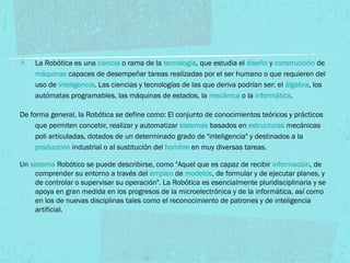La Robótica estudia el diseño y construcción de máquinas capaces de realizar tareas humanas o que requieren inteligencia. La Robótica se define como el conjunto de conocimientos para crear sistemas mecánicos poliarticulados con cierto grado de inteligencia para la producción industrial o sustituir al hombre. Las Tres Leyes de la Robótica de Isaac Asimov guían el funcionamiento de los robots para no dañar humanos.