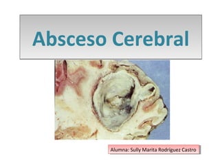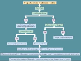 El absceso cerebral es un proceso supurativo focal del parénquima cerebral que tiene una alta morbilidad y mortalidad. Puede ser causado por propagación contigua desde infecciones cercanas como el oído medio o los senos paranasales, o por diseminación hematógena desde infecciones remotas como las pulmonares. Los síntomas incluyen cefalea, déficit neurológico y fiebre. La resonancia magnética y la tomografía computarizada son útiles para el diagnóstico. El tratamiento consiste en antibióticos de amplio es