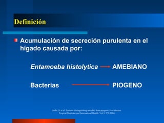El absceso hepático es una acumulación de secreción purulenta en el hígado causada principalmente por Entamoeba histolytica o bacterias. Suele presentarse en países tropicales y áreas endémicas, afectando principalmente al lóbulo derecho del hígado en personas entre 18-50 años. Su diagnóstico se realiza mediante estudios de laboratorio, de imagen como ecografía y TAC, e inmunológicos. El tratamiento de elección es el médico con metronidazol, aunque en algunos casos requiere drenaje per
