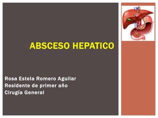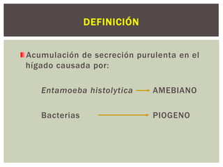 Este documento describe el absceso hepático, definido como la acumulación de secreción purulenta en el hígado. Puede ser causado por la ameba Entamoeba histolytica (amebiano) o por bacterias (piógeno). Generalmente se presenta con dolor abdominal, fiebre y hepatomegalia. El diagnóstico se realiza mediante estudios de laboratorio e imágenes como ecografía o TAC. El tratamiento incluye antibióticos y drenaje quirúrgico o percutáneo del absceso.