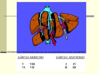 El documento describe la anatomía y el tratamiento de los abscesos hepáticos. Explica que los abscesos hepáticos pueden ser únicos o múltiples y son colecciones de pus dentro del hígado causadas por infecciones bacterianas. El tratamiento combina el drenaje del absceso, ya sea mediante catéter o cirugía, con antibióticos para tratar la infección subyacente. Los factores como una elevación de la fosfatasa alcalina, un origen biliar del absceso, y cultivos de sangre positivos se