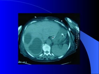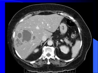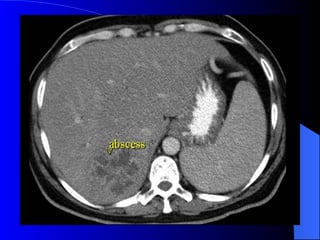 El documento describe diferentes tipos de abscesos hepáticos, incluyendo abscesos piógenos y amebianos. Los abscesos piógenos tienden a ser múltiples y son causados comúnmente por bacterias intestinales. Se diagnostican mediante imágenes y su tratamiento incluye antibióticos y drenaje. Los abscesos amebianos son generalmente únicos y causados por Entamoeba histolytica, tratándose con metronidazol y drenaje si es necesario. También describe tumores hepáticos benignos como hiperpl