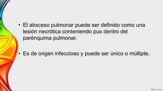 El documento describe el absceso pulmonar, incluyendo su definición, etiología, manifestaciones clínicas, diagnóstico, tratamiento y pronóstico. El absceso pulmonar es el resultado de la evolución de una neumonía causada por bacterias piógenas que ocasionan necrosis y formación de pus dentro del pulmón. Los síntomas comunes incluyen fiebre, tos, dolor torácico y expectoración purulenta. El diagnóstico se basa en el cuadro clínico y hallazgos radiológicos