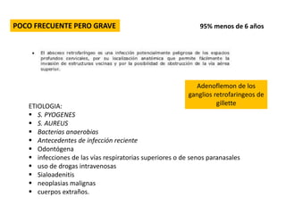 El documento describe un absceso retrofaríngeo, una infección poco frecuente pero grave que ocurre más comúnmente en niños menores de 6 años. Los agentes causales más comunes son Streptococcus pyogenes y Staphylococcus aureus, así como bacterias anaerobias. La infección se propaga a través del drenaje linfático del cuello desde infecciones de la nasofaringe, senos paranasales, muelas u oídos, lo que inflama y supura los ganglios linfáticos en el espacio retrofaríngeo.