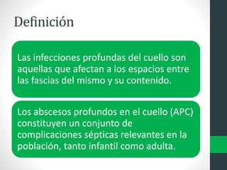 Los abscesos profundos del cuello son infecciones que afectan los espacios entre las fascias cervicales y suelen originarse de focos sépticos como infecciones dentales o amigdalinas. Su diagnóstico se basa en la clínica, punción y estudios por imagen, mientras que el tratamiento puede ser conservador con antibióticos o quirúrgico mediante drenaje. Complicaciones como mediastinitis y síndrome de Lemierre pueden surgir si no se manejan adecuadamente.