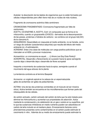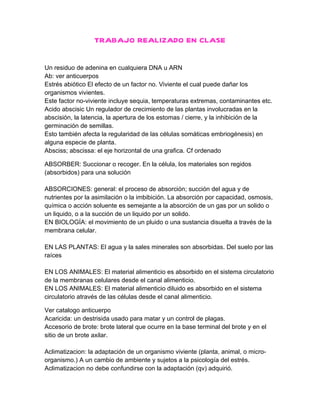 Este documento contiene definiciones breves de varios términos biológicos. Algunos de los términos definidos son adenina, anticuerpos, estrés abiótico, ácido abscísico, absorción, aclimatación y activador.