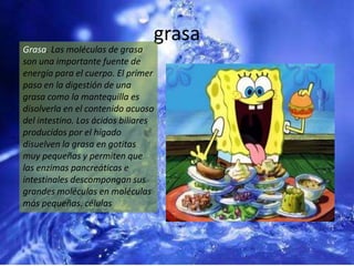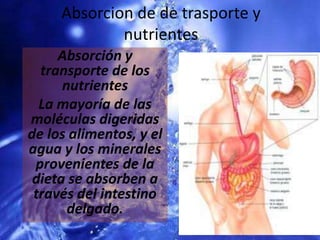 El documento describe la absorción y transporte de nutrientes en el cuerpo. La mayoría de moléculas digeridas, agua y minerales se absorben en el intestino delgado. Las grasas, carbohidratos y vitaminas se digieren y absorben de diferentes maneras. Las vitaminas se dividen en hidrosolubles y liposolubles.