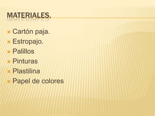 El documento describe un proyecto de arte que involucra la creación de patrones geométricos y orgánicos utilizando materiales como cartón, estropajo, palillos, pintura, plastilina y papel de colores. Se dividió el trabajo entre varias personas para cortar y pintar el cartón y papel para construir edificios, casas y una ciudad, mientras que el otro lado del cartón se usó para representar una ciudad diferente con árboles y un mar circular pintado.