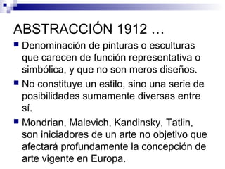 El documento describe la abstracción en el arte desde sus inicios en 1912 hasta la abstracción estadounidense de los años 1960. Los principales exponentes fueron Piet Mondrian, Vassily Kandinsky y Kasimir Malevich, quienes crearon estilos no objetivos que influyeron en Europa. Posteriormente, la abstracción fría o hard edge surgió en EE.UU. en los 60, con artistas como Frank Stella y Barnett Newman que se centraron en los elementos básicos de la pintura.