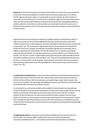 El documento discute las diferentes acciones de inconstitucionalidad en Bolivia. Explica que la acción de inconstitucionalidad abstracta puede ser presentada por altos funcionarios públicos y busca declarar inconstitucionales las leyes y decretos. La acción de inconstitucionalidad directa puede ser presentada por cualquier persona afectada y busca eliminar normas contrarias a la constitución. El tribunal constitucional plurinacional ha establecido que ambas acciones tienen el objetivo de someter las normas cuestionadas a un juicio de constitucionalidad.