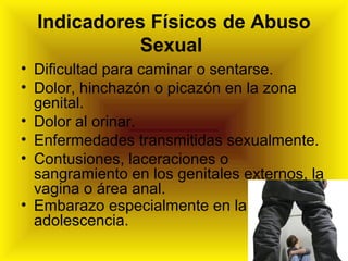 El documento describe los indicadores físicos y de comportamiento del abuso sexual infantil, así como desafíos en la validación de denuncias de abuso. Algunos indicadores físicos incluyen dolor o sangrado genital. Los indicadores de comportamiento incluyen regresión, cambios de humor y abuso de sustancias. La validación de denuncias se complica por litigios previos, interrupción de contactos familiares y sesgos entre profesionales involucrados.