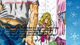 Este documento define y explica diferentes tipos de abuso sexual como la violación, el estupro, el abuso infantil y el acoso sexual. Describe los signos de posible abuso sexual y explica que el abuso infantil ocurre cuando un adulto usa a un niño para estimularse sexualmente. También diferencia entre abuso infantil y estupro, señalando que este último implica menores de 18 años que dan su consentimiento debido al engaño.