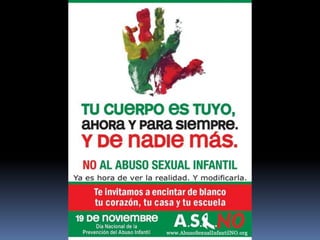 Este documento presenta el caso de una niña de 6 años y 9 meses que fue evaluada por posible abuso sexual. Se describe su historia clínica, exámen físico, y evaluación psicosocial que reveló disfunción familiar severa. El diagnóstico incluyó infección por VPH, dermatitis atópica y riesgo psicosocial. El plan terapéutico incluyó apoyo al equipo psicosocial, abordaje familiar, tratamiento médico y control con salud mental. Adicionalmente, el documento provee antecedentes sobre abuso sexual infant