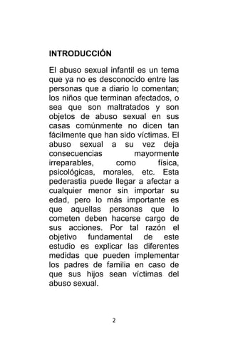 El documento trata sobre el abuso sexual infantil. Explica que es un problema común del que pocas víctimas hablan. Describe los tipos de abuso, los signos psicológicos y las posibles soluciones. En Medellín, Colombia, se reportaron más de 240 casos de abuso sexual infantil en 2005. El gobierno colombiano está tomando medidas como aumentar las penas de cárcel para los abusadores.
