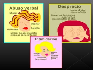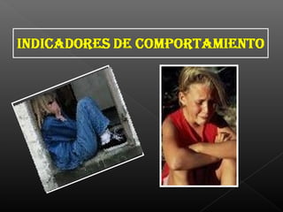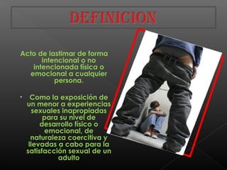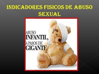 Este documento describe diferentes tipos y manifestaciones de abuso, incluyendo abuso físico, sexual, emocional y negligencia. Define el abuso sexual y enumera diversas conductas sexuales inapropiadas. También identifica posibles señales de abuso en niños y adolescentes a nivel físico, emocional y de comportamiento.