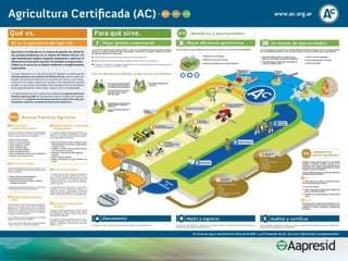 El documento describe varias medidas implementadas para mejorar la seguridad y protección ambiental, incluyendo la reubicación del depósito de agroquímicos, mejor disposición de residuos, capacitación al personal, y monitoreo de fertilización de cultivos y carbono orgánico en los suelos. También presenta indicadores de rendimiento, productividad, costos y ganadería para medir la eficiencia e innovación productiva.