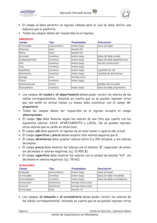 La base de datos BDInmobiliaria.MBD contendrá 7 tablas (Propietarios, Arrendatarios, Inmuebles, Alquileres, Ciudades, Departamentos) para gestionar información de una inmobiliaria. Cada tabla incluirá campos relevantes y se definirán relaciones entre tablas requiriendo integridad referencial.